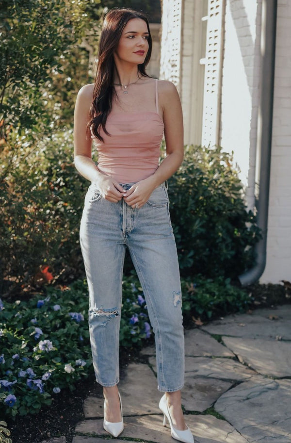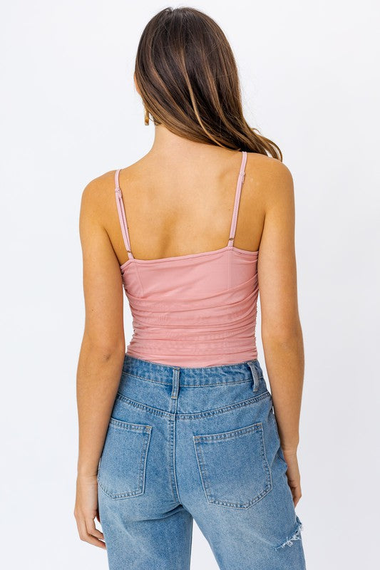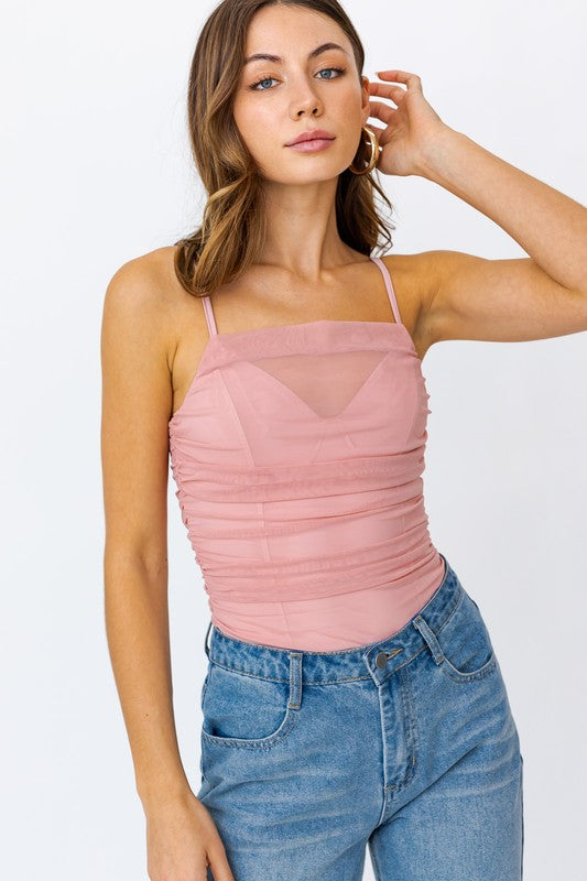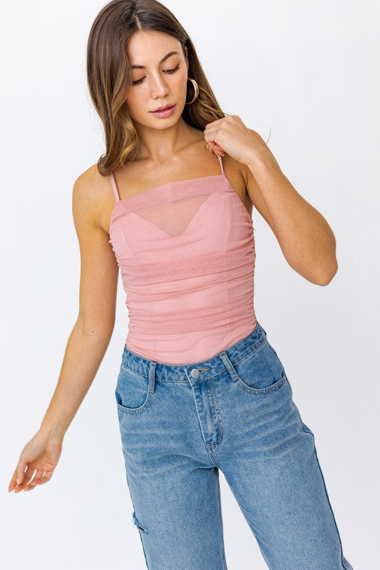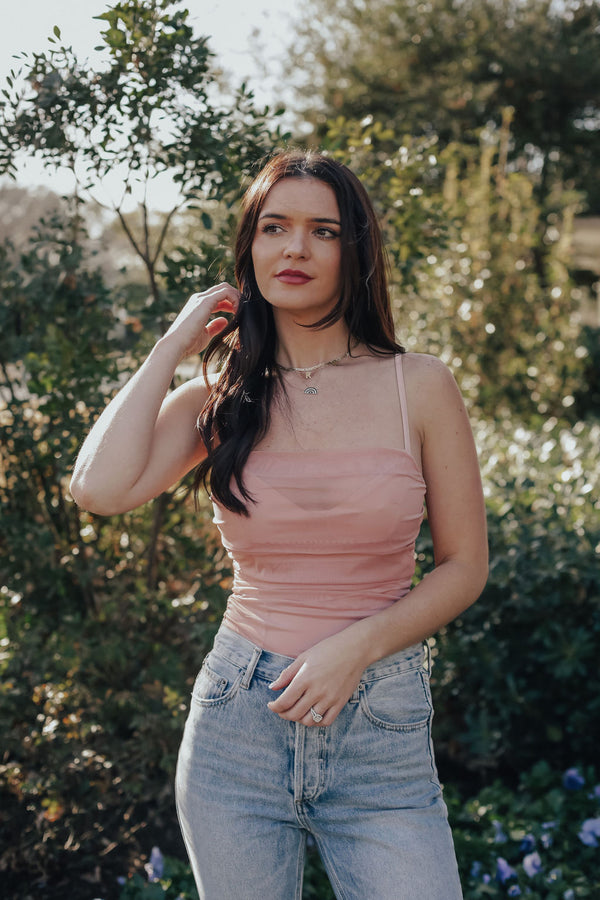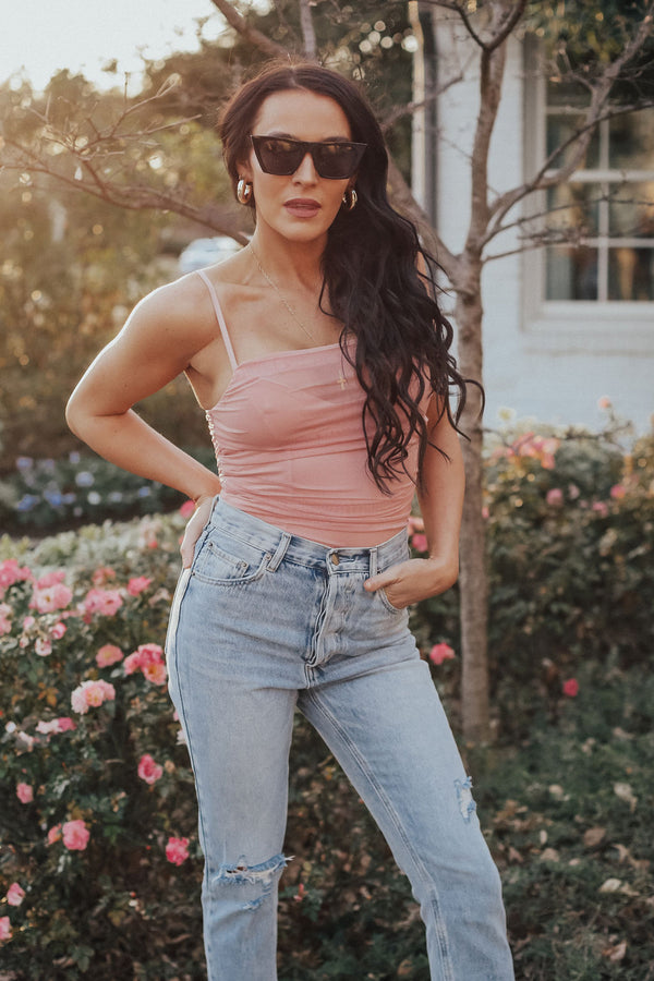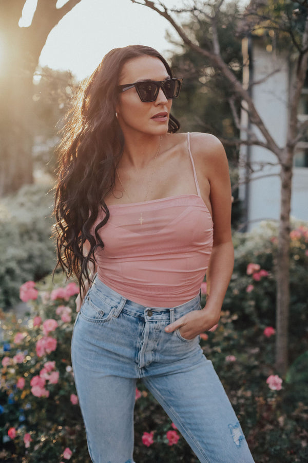 Blush Mesh Bodysuit 95%POLYESTER 5%SPANDEXMODEL IS WEARING A SIZE SMALLMODEL SPECSHEIGHT: 5'8"BUST: 32AWAIST: 24"HIPS: 34"