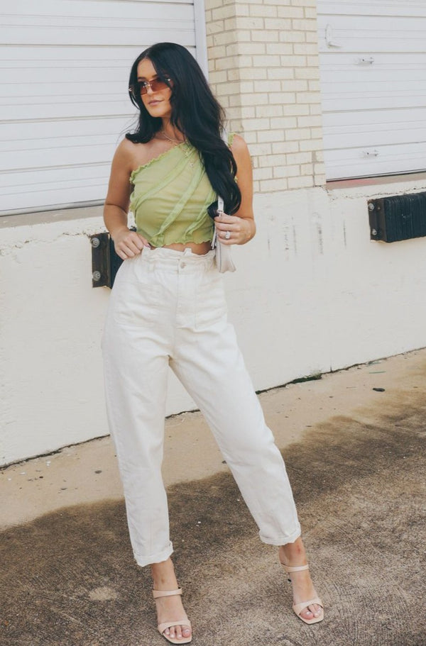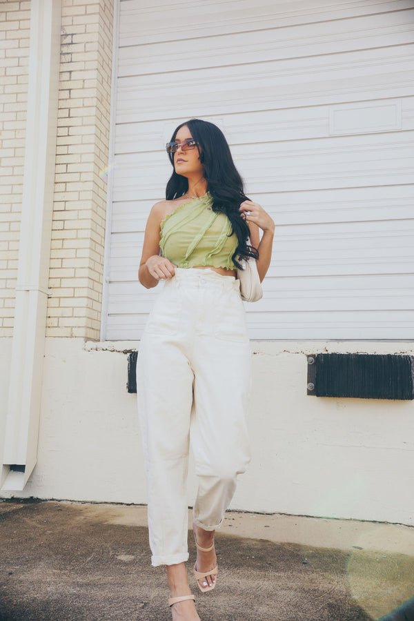 Cargo Pants- High waist pants- Elastic band at waist- Pockets at side- Button closure at center front- Hand wash cold- Do not bleach- Do not tumble dry- Iron lowSize & FitTotal length: 38", Waist: 26.50"Fabric100% Cotton