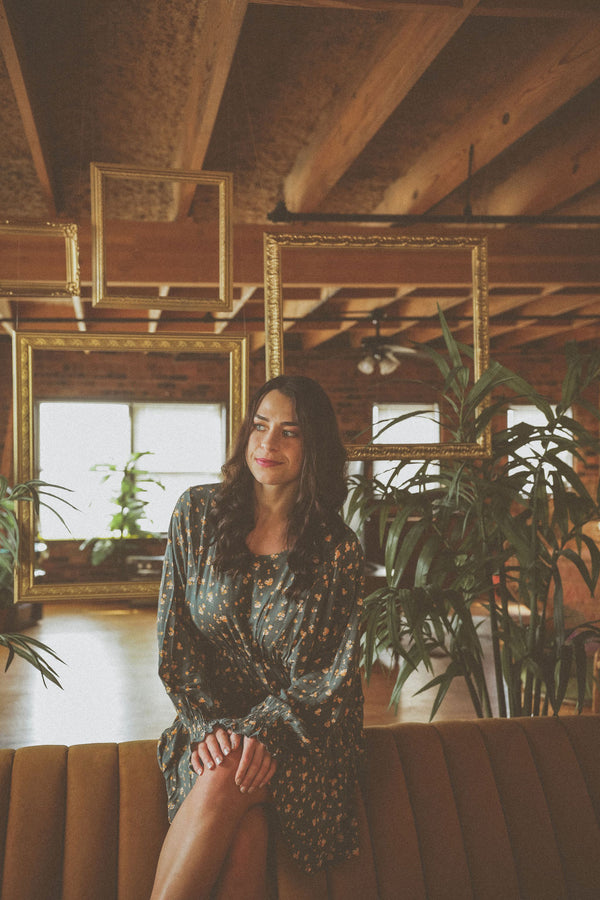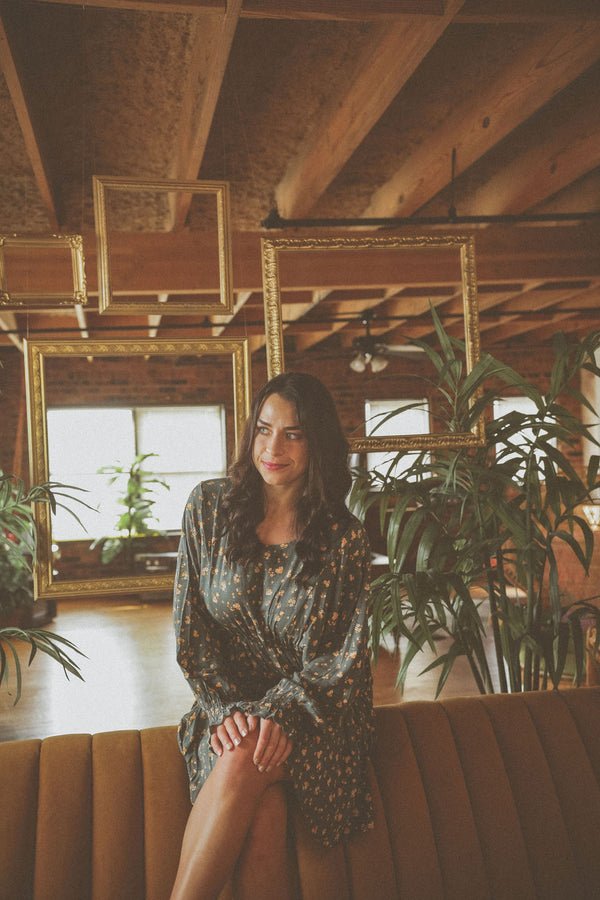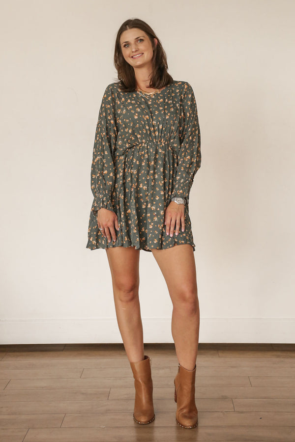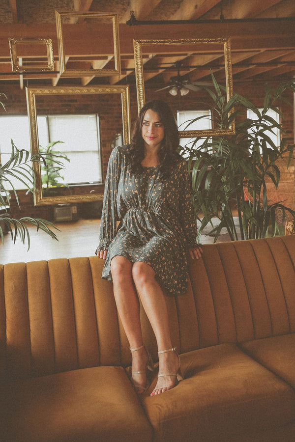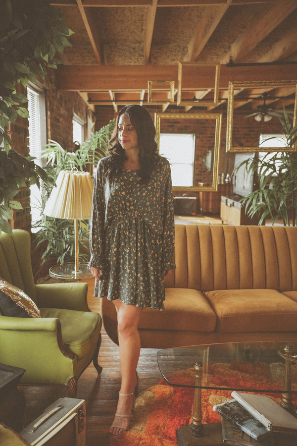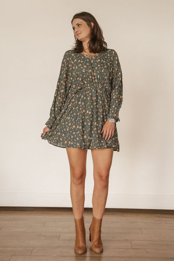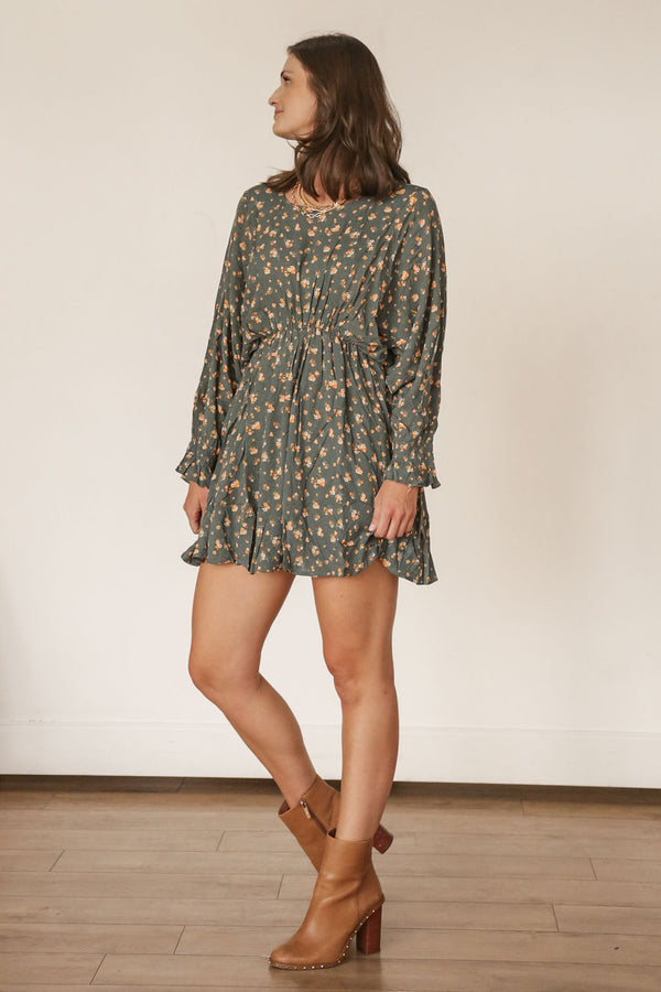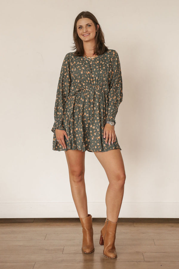 Flower print woven dress with round neck, gathered seaming at waist in flowy silhouette.
