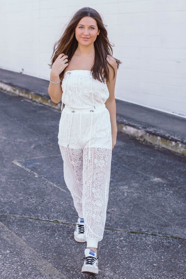 Tube top lace jumpsuit with cinched waist!  Fabric: 70% COTTON 30% NYLON LINING 100% POLYESTER